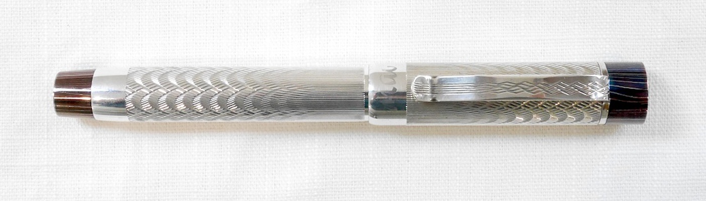 The top of the line of Conway Stewart pens was the Metal Writer series. They have an imposing weight and presence. This pen is design #RR3 and is #11 of only 18 made. The pen is solid sterling silver with mokume gane finials, each unique. Using a cartridge/ Converter fill, this pen is new and in-used. R53