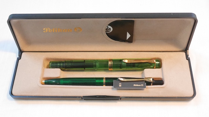 The 200 series is Pelikan's entry level of fine writing instruments. While more basic than their pricier brethren, the series is often where Pelikan designers get playful. This new-old-stock set, with early, "W. Germany" marking, is made in transparent Green hearkening back to the exclusive and exotic demonstrator of the 1950s and the top line translucent Green M800 available today. Have a charming Green Demo FP/ BP set in your collection at a bargain price. (DAA63)